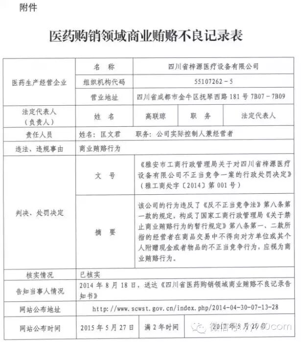 根据《雅安市卫生局关于报送商业贿赂不良记录的报告》(雅市卫[2014]167号),经核实,按照《国家卫生计生委印发,关于建立医药购销领域商业贿赂不良记录的规定>的通知》(国卫法制发[2013]50号)规定,决定将四川省梓源医疗设备有限公司、四川康祥医药有限公司2家企业列入医药购销领域商业贿赂不良记录(详见附件)。全是公立医疗机构或接受财政资金的医疗卫生机构再不良记录名单公布后两年内不得购入其药品,医用设备和医用耗材。