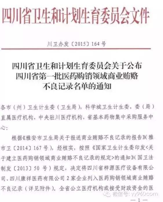 5月28日,四川省卫计委公布第一批医药购销领域商业贿赂不良记录名单,其中四川省梓源医疗设备有限公司、四川康祥医药有限公司2家企业列入医药购销领域商业贿赂不良记录,全是公立医疗机构或接受财政资金的医疗卫生机构再不良记录名单公布后两年内不得购入其药品,医用设备和医用耗材。